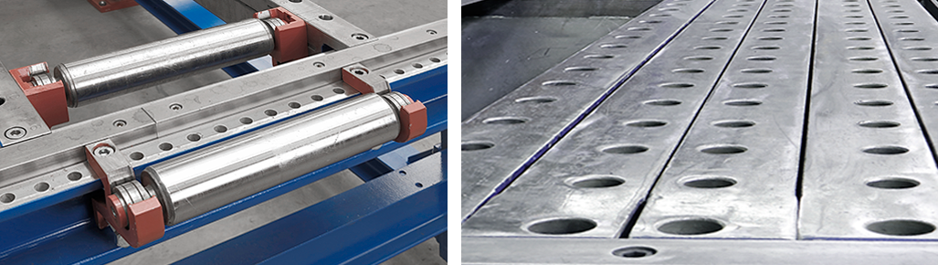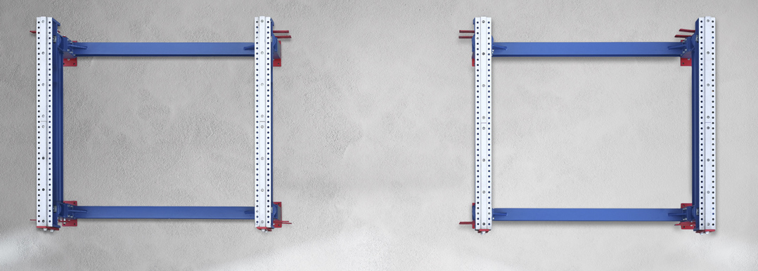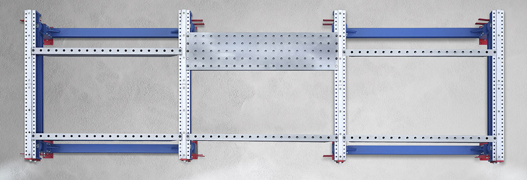 Beliebig viele Grundrahmen werden im Abstand von zwei Metern in Reihe montiert. Beim ersten Blick fällt auf, dass die Grundrahmen offen und leer sind. Keine Leisten, keine Tischplatten, auf denen gearbeitet werden könnte. Erst das patentierte Einlegersystem macht aus einem Grundrahmen einen Arbeitsplatz.